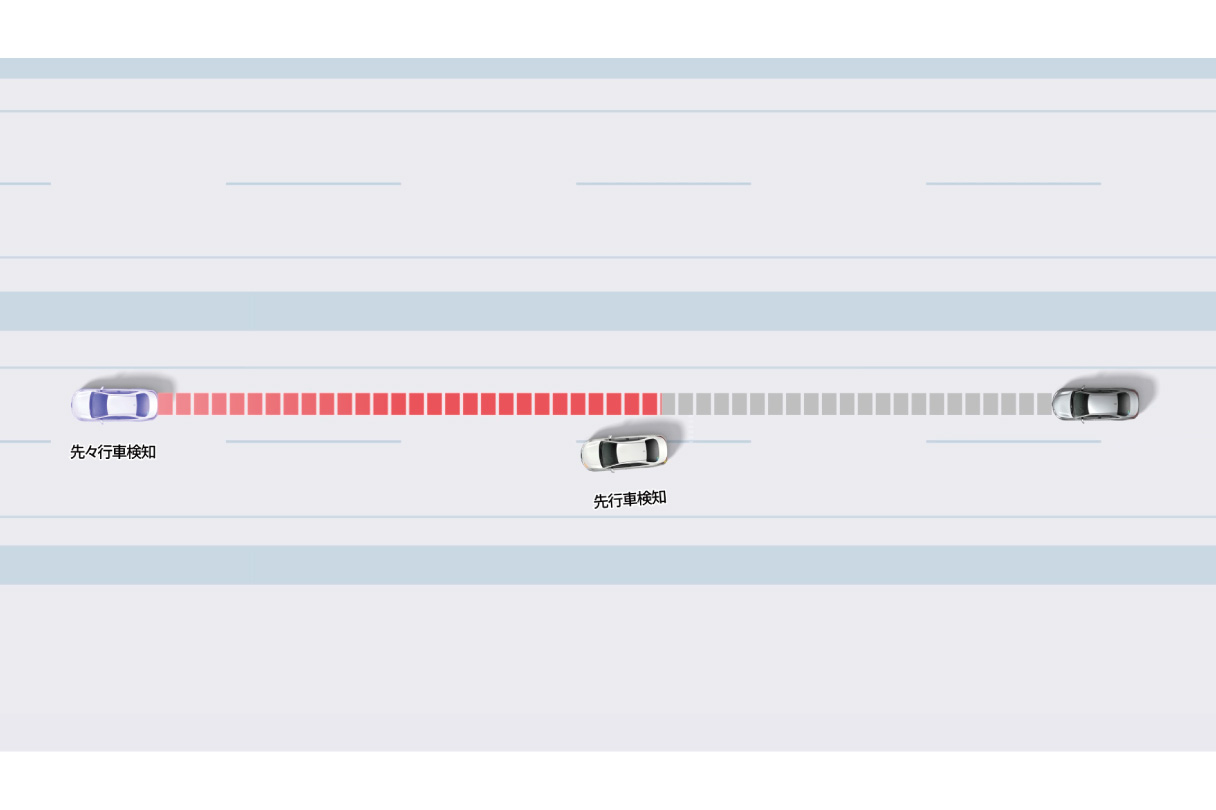 レーダークルーズコントロールで先行車に追従している時、先行車が通信利用型レーダークルーズコントロール対応車両であれば、車車間通信により取得した先行車の加減速情報にすばやく反応して車間距離や速度の変動を抑制し、スムーズな追従走行が可能となります。