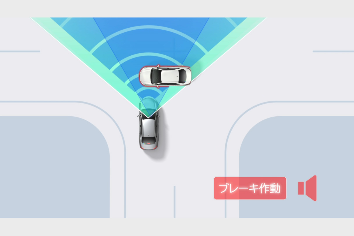 交差点で一旦停止時、クルマ同士の直接通信で左右から接近する死角の車両を検知。接近している車両がいるにもかかわらずドライバーが発進しようとした場合に、表示とブザー音による注意喚起を行い、安全に交差点に進入できるよう支援します。