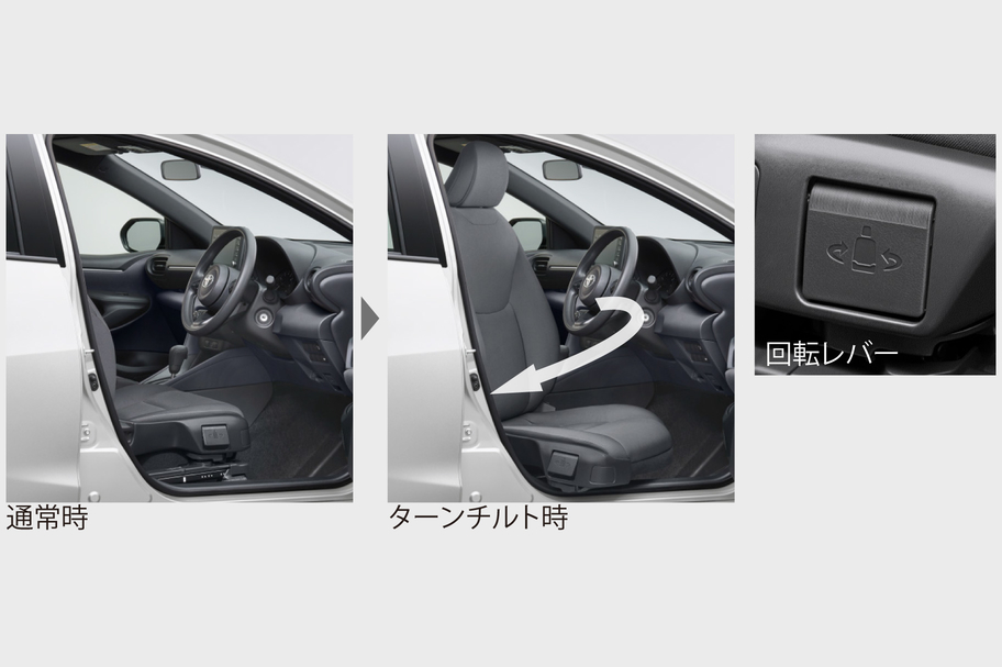 シートが回転しながらチルトする(傾く)機構を、運転席・助手席に設定。乗降の際、シート横の回転レバーを操作してシートを回転&チルトさせることで、両脚をそろえたままスムーズな乗り降りが可能になります。また、乗降時の足腰への負担軽減にも貢献します。回転&チルト後のシートは、背もたれを軽く押すことで車内に戻すことができます。*1